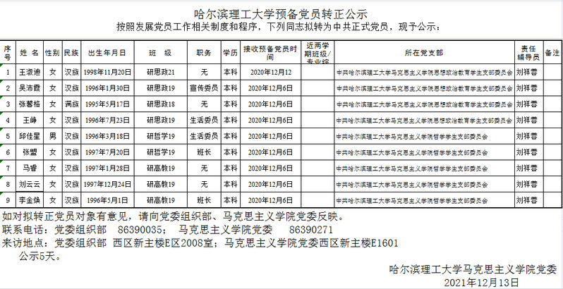 哈尔滨理工大学预备党员转正公示
