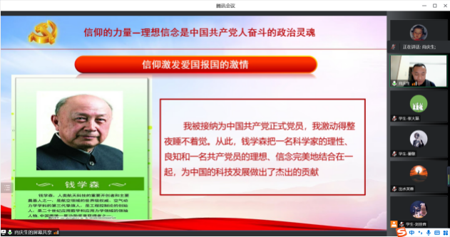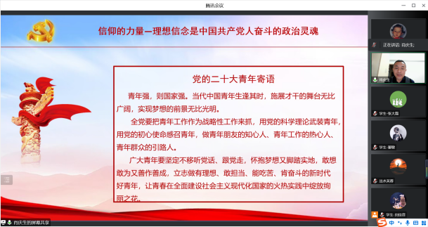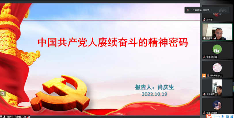 在中国共产党第二十次全国代表大会胜利召开之际,为了弘扬伟大建党精神、赓续共产党人精神血脉,马克思主义学院分党校于2022年10月19日晚18时以线上腾讯会议的形式开展了“中国共产党人赓续奋斗的精神密码”为主题的党课培训,此次培训会议由学院党委书记肖庆生主讲,副处级辅导员刘祥蓉主持。35名师生预备党员和9名教师发展对象参加了此次培训。
