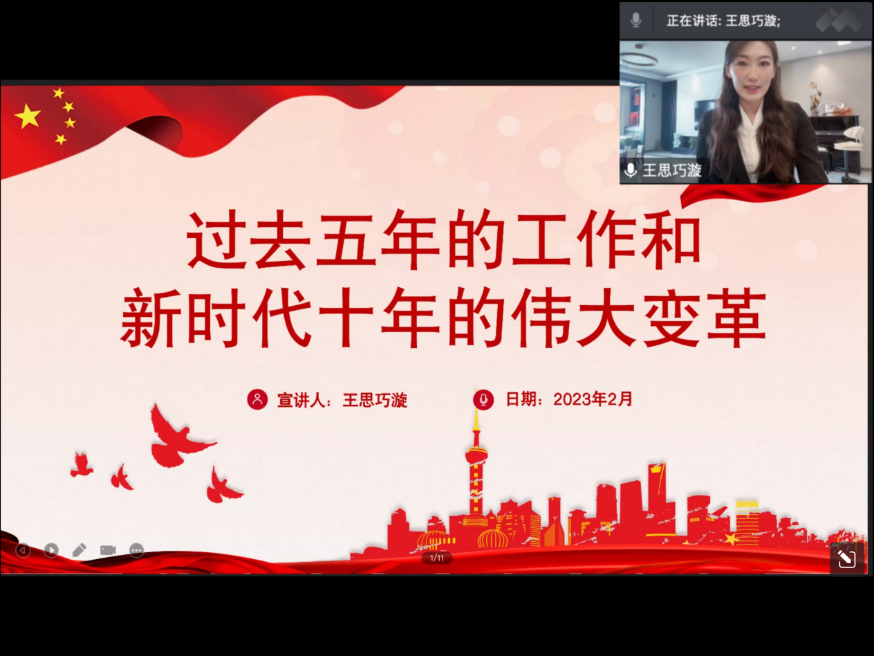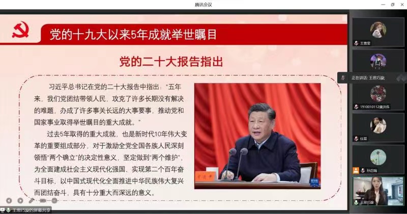 感悟思想伟力,把握精神实质。为进一步学习宣传贯彻党的二十大精神,深入推进习近平新时代中国特色社会主义思想落地生根,引领马克思主义学院学生踔厉奋发,勇毅前行。马克思主义学院团委于2023年2月22日组织开展党的二十大精神线上宣讲活动。本次活动邀请我院学生党的二十大精神宣讲团成员,学院硕士研究生王思巧漩同学作《过去五年工作和新时代十年伟大变革》为主题的宣讲。马克思主义学院本科生辅导员孙启瑞老师及全体学生参加此次宣讲会。