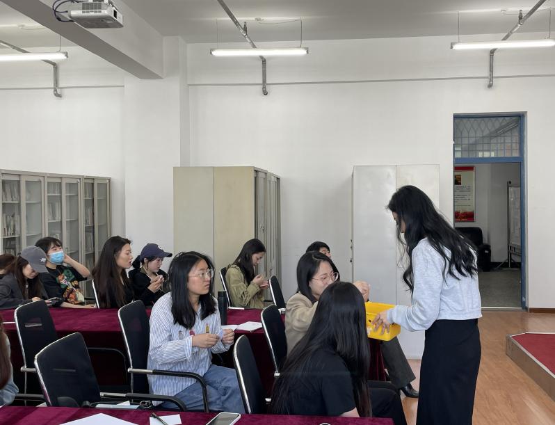 研21级思政团支书徐程和同学们做心理测试及心理互动小游戏