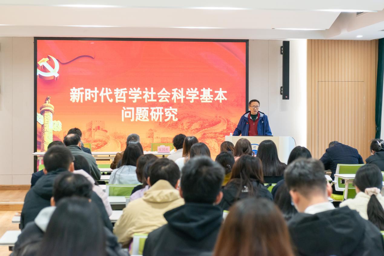为帮助学院师生拓展理论视野,熟悉学科发展前沿,搭建学术交流平台,启迪学术思维,提升学术研究能力,10月14日上午,学院邀请中央马克思主义理论研究和建设工程首席专家、教育部全国高校思政课教学指导委员会咨询委员会委员、全国哲学社会科学规划办公室原主任、中宣部理论局原副局长、中国文化软实力研究中心主任张国祚教授作了题为“新时代哲学社会科学基本问题研究”的学术报告。报告会由马克思主义学院院长叶丽主持,党委宣传部、学院教师以及研究生等80人余参加报告会。
