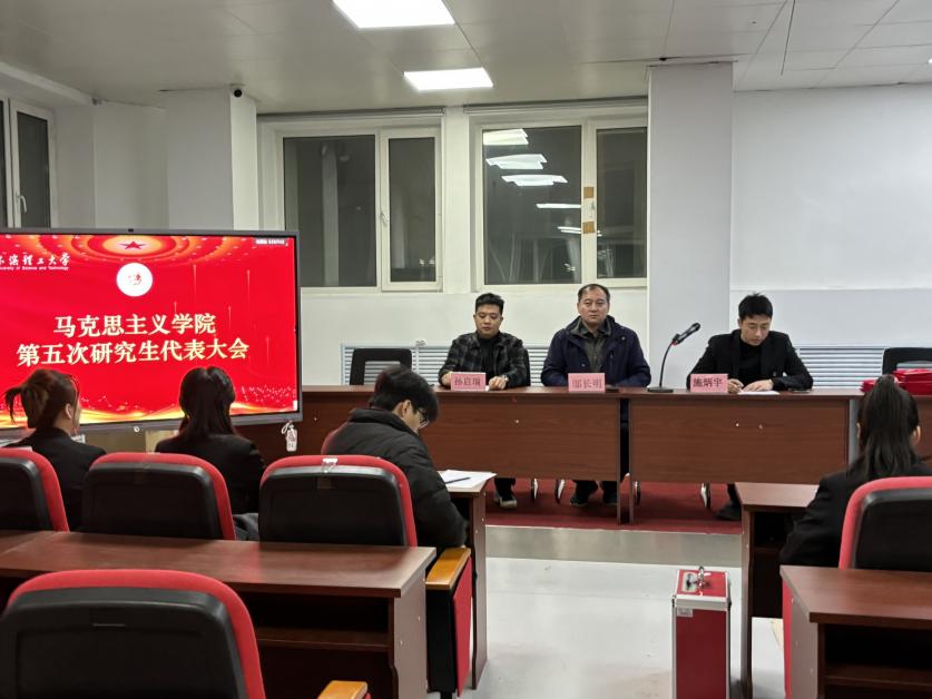 2025101418:00,哈尔滨理工大学马克思主义学院第五次研究生代表大会在西区七号楼二楼会议室隆重召开,会议采用线上线下同步进行的方式,马克思主义学院党委副书记邬长明、研究生会秘书长、学生会指导教师孙启瑞线下出席会议,副处级辅导员、研究生会指导教师刘祥蓉老师线上参会,大会由马克思主义学院研究生会主席施炳宇主持。