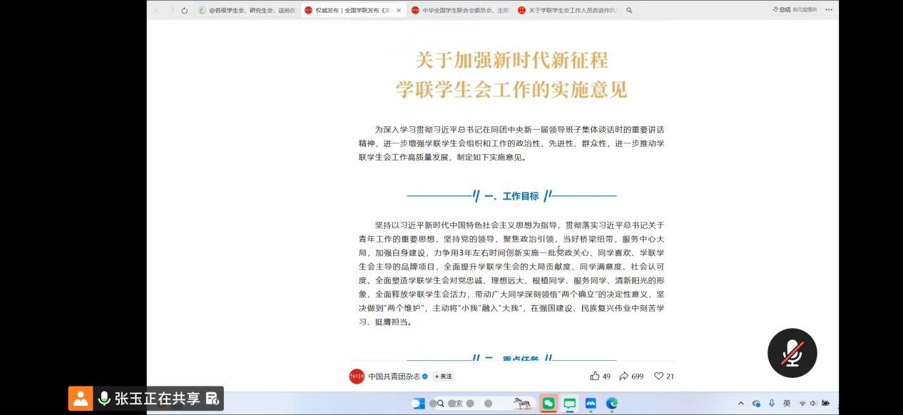 本次学习围绕多项核心制度文件展开,重点学习了《关于巩固高校学生会(研究生会)改革成果的若干措施》《关于加强新时代新征程学联学生会工作的实施意见》《深化新时代教育评价改革总体方案》《中华全国学生联合会委员会、主席团工作规则(试行)》《关于学联学生会工作人员改进作风服务同学的若干规定》《关于推动高校学生会(研究生会)深化改革的若干意见》等内容。