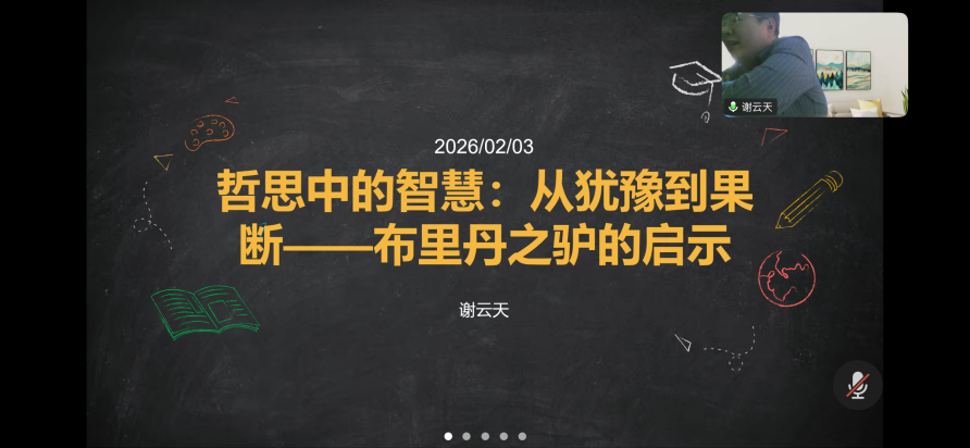 第二场讲座面向七年级初中生,主题为《哲思中的智慧:从犹豫到果断——布里丹之驴的启示》。谢云天老师以14世纪法国哲学家布里丹的著名悖论“布里丹之驴”引入:一头完全理性的驴子站在两堆草中间,因无法理性决断哪一堆更好,最终因犹豫而饿死。这一思想实验叩问自由意志与选择的本质。谢老师通过生动案例——学习中面对多个兴趣社团的纠结、升学时在热门专业与热爱方向间的权衡、生活中遇到两难选择时的彷徨——引导学生剖析犹豫的根源:过度追求“完美理性”往往导致行动瘫痪。他进一步指出,真正的智慧在于:在信息对等、价值相当的情境下,果断做出选择,并通过后续行动验证与调整;思政教育中的“果断”,不仅是个人品质的锤炼,更是青少年一代在新时代伟大征程中勇于担当、主动作为的价值追求。讲座以“选择即责任,选择即成长”的总结升华主题,鼓励中学生在哲学思辨中培养坚定的意志与清醒的判断力。