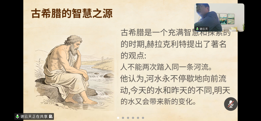 首场讲座面向六年级小学生,主题为《川流不息话思辨:一场关于变化的思政课》。谢云天老师以古希腊哲学家赫拉克利特“人不能两次踏进同一条河流”的经典命题开篇,引导孩子们直观感受“万物皆流、无物常驻”的哲理。通过多媒体展示奔腾的江河、生长变化的树木、四季更迭的景象,结合日常生活中的“小变化”——如自己从幼儿园到小学高年级的成长、手机从旧款到新款的更新,谢老师深入浅出地阐释:世界永远在运动、变化之中,正是这种“川流不息”的流动,构成了生命的活力与进步。孩子们在互动中领悟到,面对变化不应畏惧,而要以积极心态拥抱、适应,并在变化中保持对美好价值的坚守。讲座以“小树苗如何长成大树”的寓言收尾,强调个人成长如河水奔流,需要在党的教育指引下,不断汲取营养、砥砺前行。