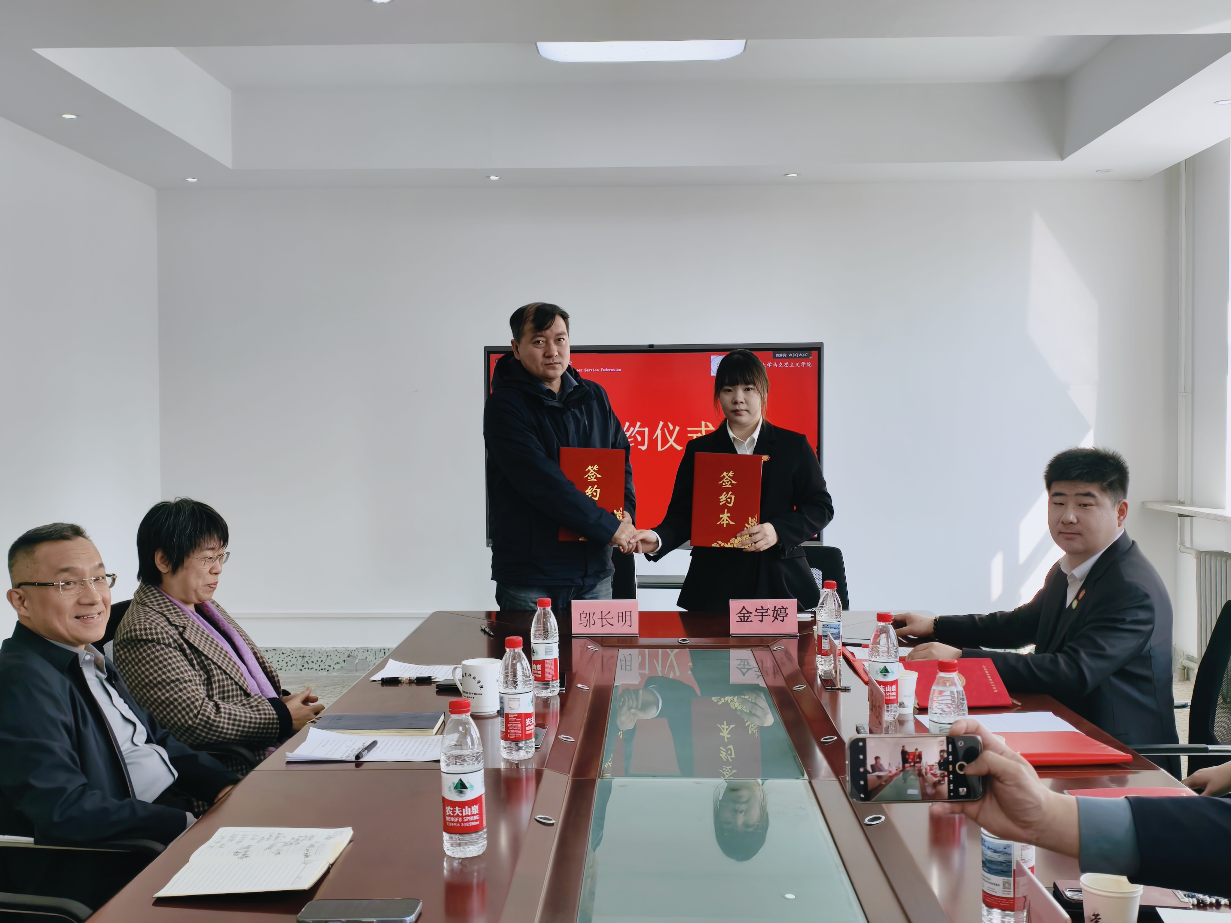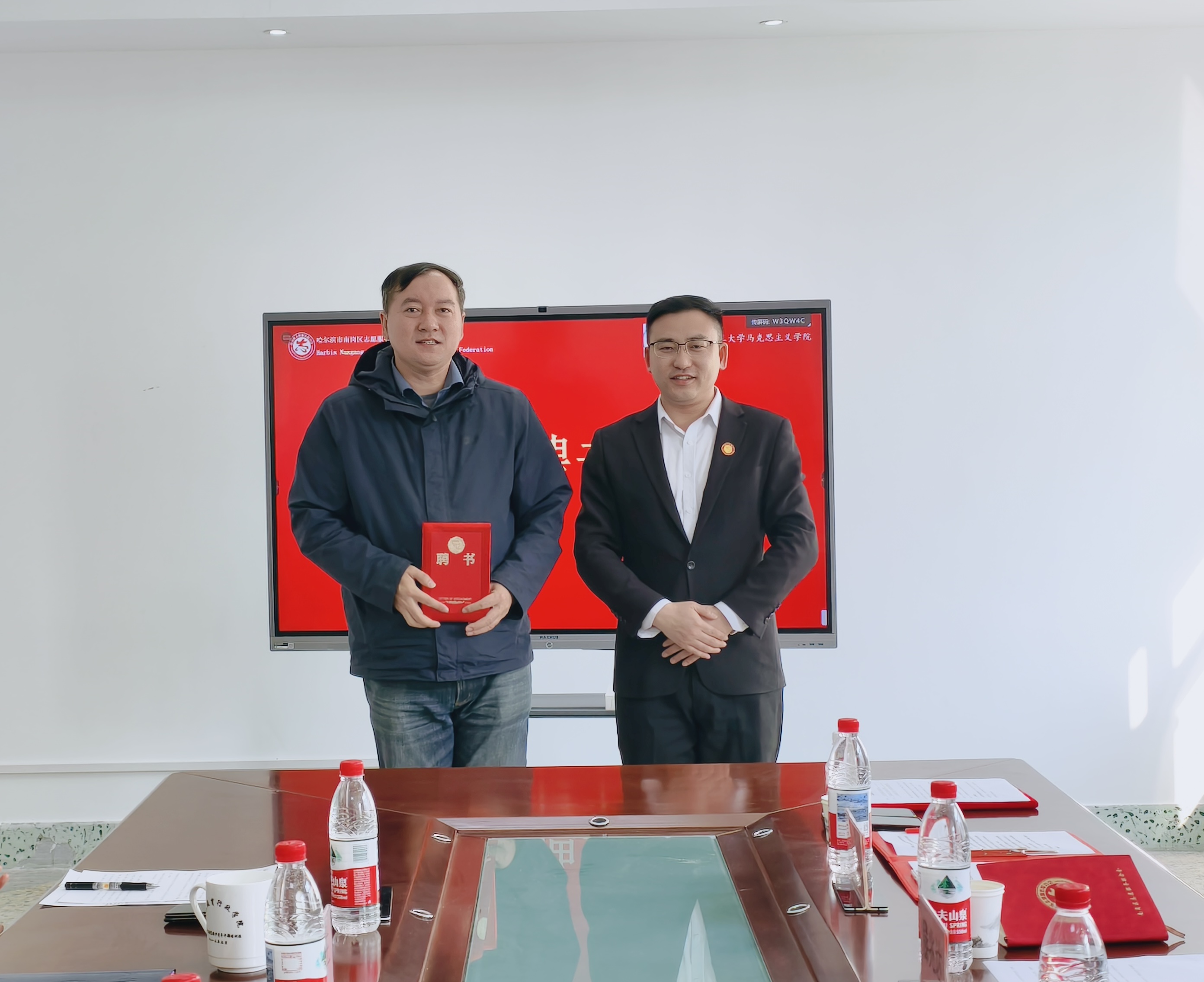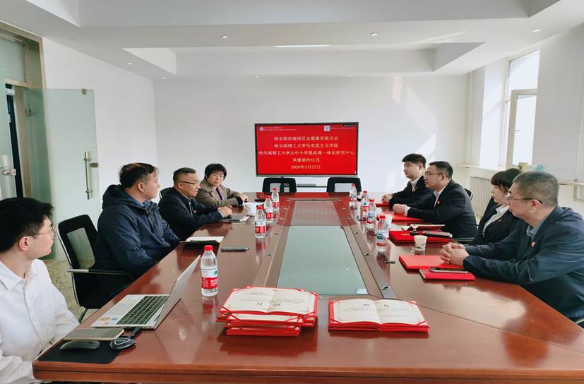 为贯彻落实《中华人民共和国国民经济和社会发展第十五个五年规划纲要》有关精神,创新实践育人形式,促进思政课堂和社会课堂有效融合。深化校地协同育人机制,推动志愿服务与思政教育深度融合,促进资源共享与优势互补,3月27日上午,马克思主义学院、大中小学思政课一体化研究中心与哈尔滨市南岗区志愿服务联合会志愿服务共建签约仪式在马克思主义学院207会议室举行。