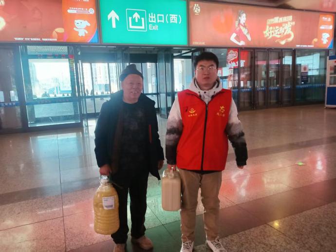 此外,一位行动不便的老人到哈尔滨西站来顺志愿服务驿站求助,称不熟悉流程,不知如何领取从山海关托运来的花生油。修兆祺耐心接待,全程陪同服务,先陪老人到服务台咨询流程,随后步行近2公里、耗时20分钟,护送老人前往中铁快运,协助老人完成身份核验、发票开具、货物领取等流程。返程时,先送老人回驿站休息,又亲自护送至地铁口。老人满怀感激,连连致谢,他用贴心服务为老年旅客传递了温暖。